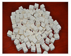 FD豆腐是以大豆為原料加工而成,水分在5%以下,尺寸在15×12×8mm、12×12×12mm、12×12×6mm不等,色澤淺黃色或白色。真空冷凍干燥豆腐結構緊密,但不失鮮嫩豆腐固有的口感特征,可干食或加工成佐餐湯料后食用,該產品用95℃以上的清水浸泡30秒鐘即可復原,復原后的產品口感細膩、潤滑、鮮豆乳味道突出。